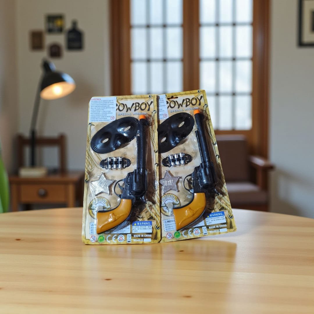 ¡Prepárate para vivir aventuras en el Lejano Oeste! Este set incluye una pistola de juguete, una placa de sheriff y un antifaz para completar el look. Perfecto para juegos de rol, estimula la creatividad y la diversión en cada duelo imaginario.